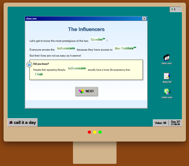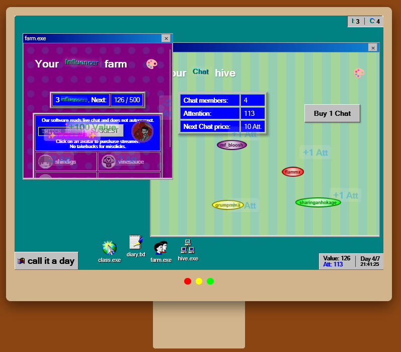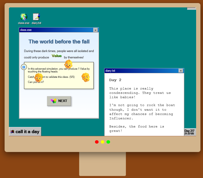 Mechanics: Visual Novel / Clicker-incremental / Multitasking / Window-organizing / Economy management / DVD idle screen.