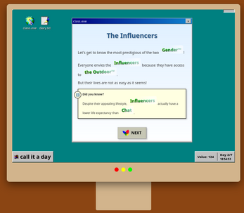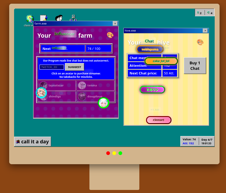 A surrealist science-fiction short story/management game hybrid. Think Black Mirror with live twitch integration xD